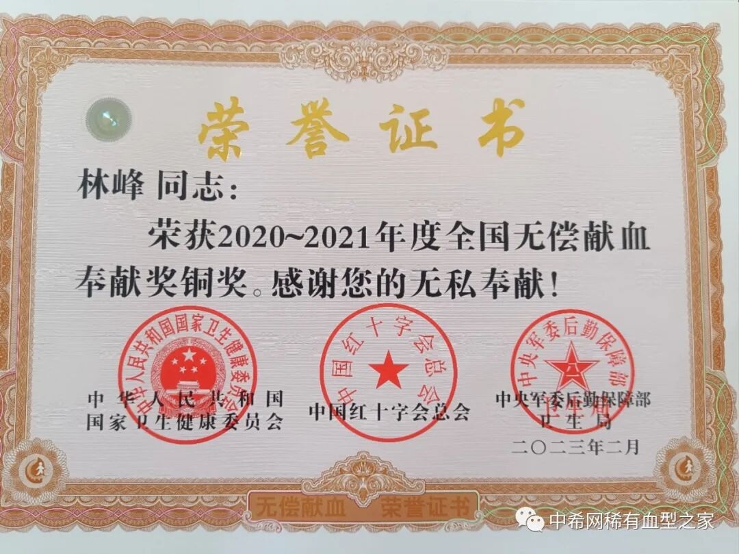中希网林峰同志荣获2020-2021年度全国无偿献血奉献奖铜奖。